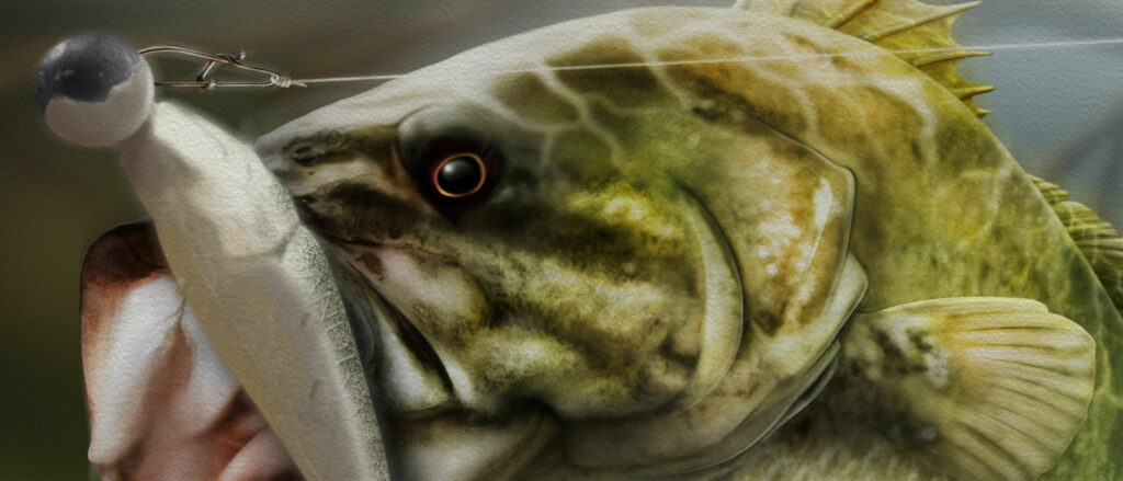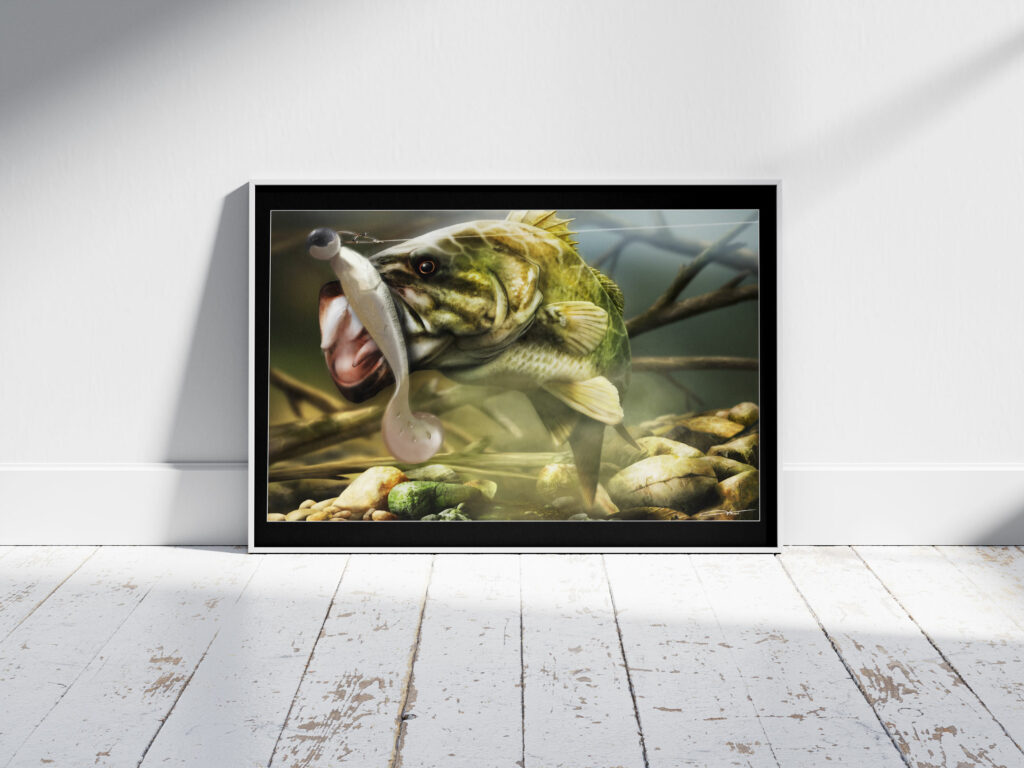 Comme pour l’autre blackbass, j’ai imaginé une action de pêche en m’inspirant de vidéos subaquatiques. Deuxième version réalisée avec plus de réalisme mais après 10 heures de travail et quelques références de vidéos de pêche réalisées en Californie, j’ai réévalué entièrement la colorimétrie trop terne et monochrome bien que très fidèle à ce que perçoit l’œil humain. Chose que je n’aurai jamais eu la possibilité de corriger en peignant à l’huile ou à l’acrylique. Illustration personnelle sans photobashing* qui m’a demandé 24 heures de travail.